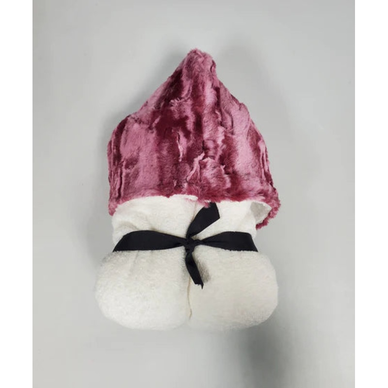 White towel with raspberry fur hood.CottonMade in USADesigned for maximum comfort, durability and absorbanceFun, stylish and makes for the perfect gift100% Top Quality Natural Cotton Terry100% Designer Cotton Hood w/ Natural Cotton Terry ReverseTowel Size