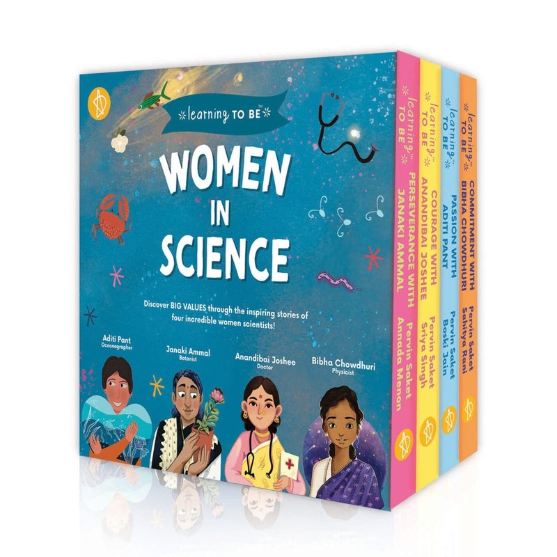 TheWomen in Scienceboxed set includes the inspiring stories of 4 pioneering women:Commitment with Bibha Chowdhuri(first Indian woman physicist),Couragewith Anandibai Joshee(one of the first Indian women to become a doctor),Passionwith Aditi Pant(the first Indian woman oceanographer), andPerseverancewith Janaki Ammal(the first Indian woman botanist).