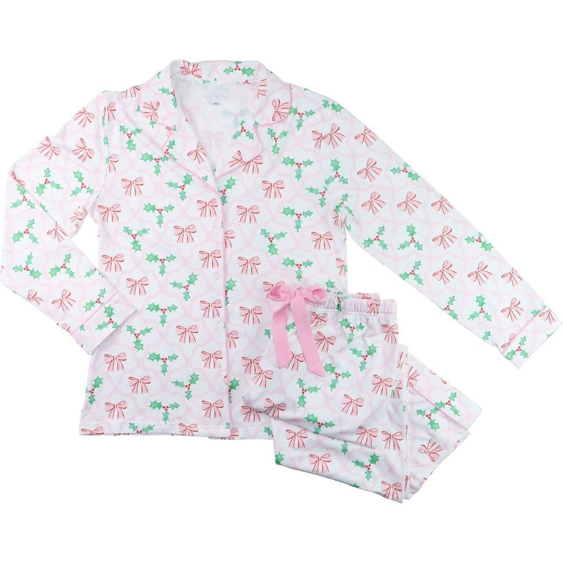 These festive Women's Holly And Bow Knit Pajamas feature an allover print of pink bows and green holly leaves, perfect for the holiday season. Made from soft, breathable fabric with a button-up top and elastic waist bottoms, they offer both comfort and che