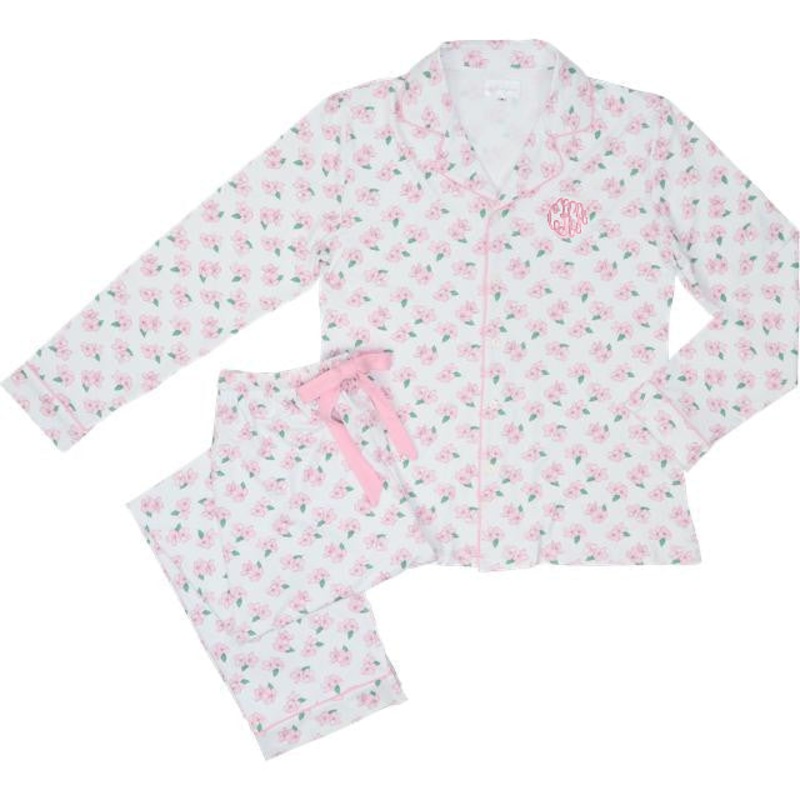 Drift off in comfort and style with our Ladies Magnolia Knit Pajamas, featuring a soft pink magnolia print on a cozy white background. This classic button-down top pairs with matching pants adorned with a pink drawstring, offering a relaxed fit and charming feminine detail. Perfect for lounging or bedtime, these pajamas bring a touch of southern elegance to your nightly routine.
