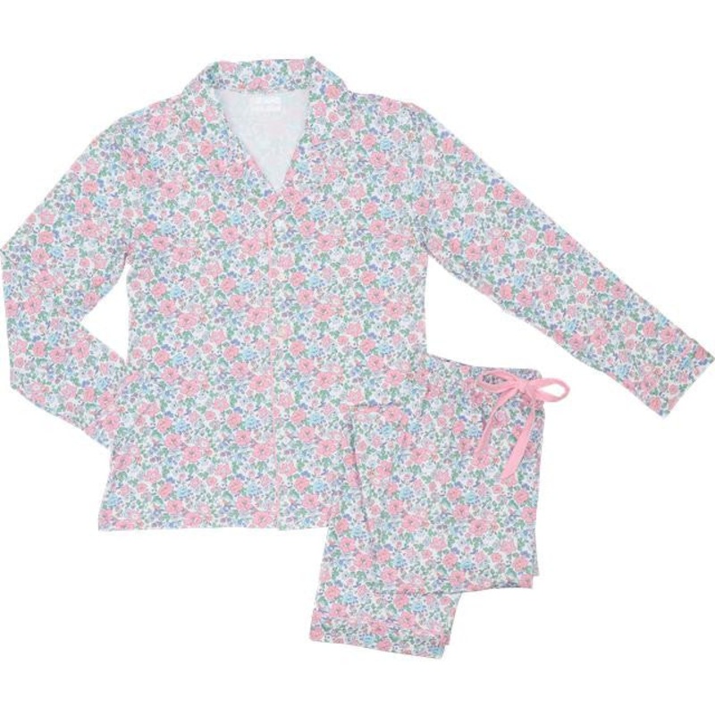 Drift off in elegance with our Ladies Pink and Blue Liberty Print Pajamas, featuring a romantic floral pattern in soft, soothing hues. The tailored button-up top and coordinating pants are crafted from breathable knit fabric with a touch of stretch for all
