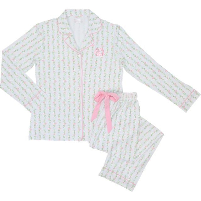 Unwind in style with our Ladies Pink and Green Floral Knit Pajamas, designed for both comfort and charm. Featuring a delicate floral stripe pattern and finished with pink piping, this classic button-up top and matching drawstring pants offer a flattering a