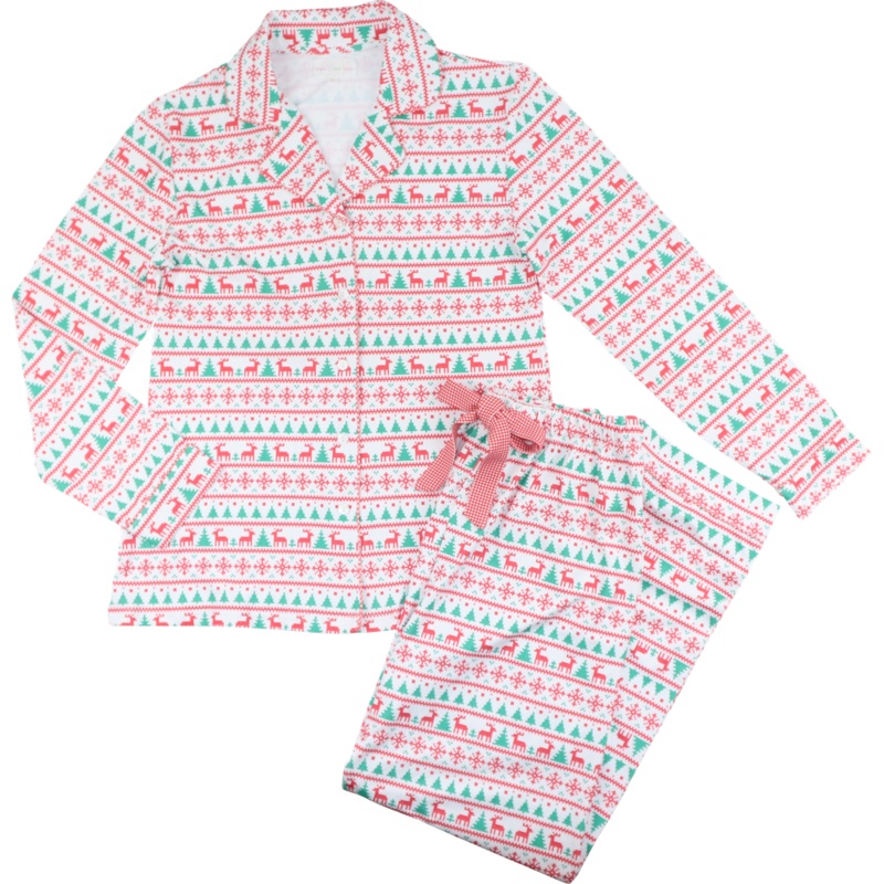 These festive Women's Red And Green Christmas Print Knit Pajamas feature a cheerful red, green, and white Fair Isle pattern with reindeer, snowflakes, and Christmas trees. Made from soft, cozy fabric with a button-up top and ribbon-tie waist pants, theyre