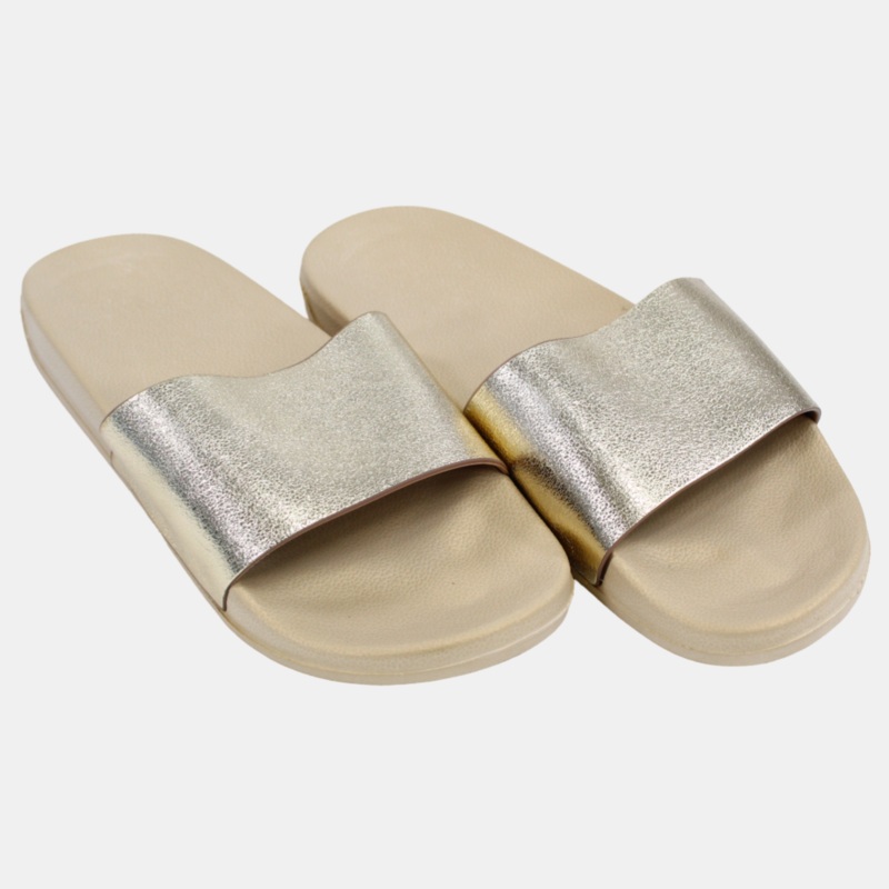 Add a touch of elegance to your everyday wear with these metallic gold rubber slides. Designed for comfort and durability, they offer a lightweight feel with a secure, slip-resistant sole for all-day ease.Soft and flexible rubber Provides lasting comfortNo