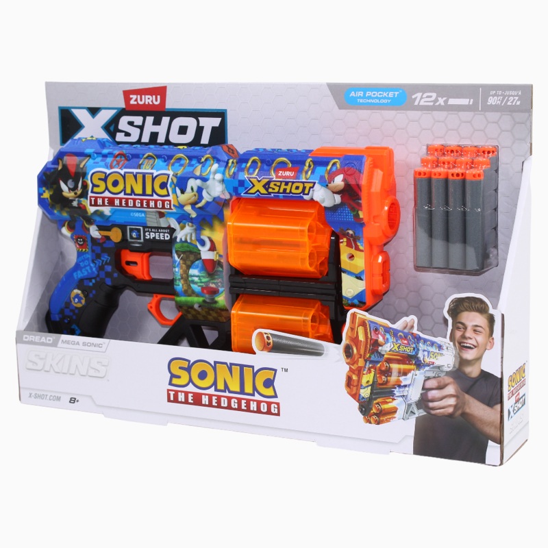 Dash into battle with Sonic style! Featuring iconic character designs and high-speed action. Dual drum system (12 darts total) Shoots up to 27m powered by air pocket darts Sonic-themed skin for fans of the franchiseIncludes: 1 Dread Sonic Blaster, 12 darts