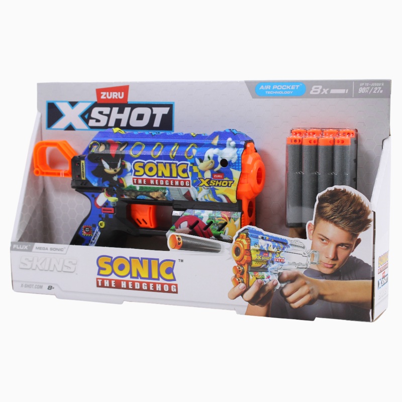 Compact power in Sonic style! The Flux Mega Sonic blaster is made for quick wins. Fires up to 27m with air pocket tech Easy-load chamber plus extra storage Sonic-themed skin for added flairIncludes: 1 Flux Blaster, 8 darts. Recommended for ages 8+.