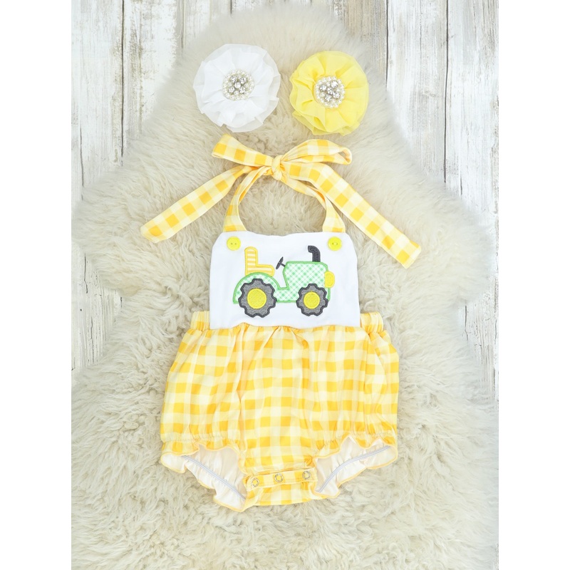 How cute is this sister set! We love the yellow and white check print, tractor appliqu, ruffle trim and halter neckline!Fits true to size.50% Cotton, 50% Polyester.Accessories sold separately.Snap buttons.Adjustable tie neckline.Add $6.99 for the headband.