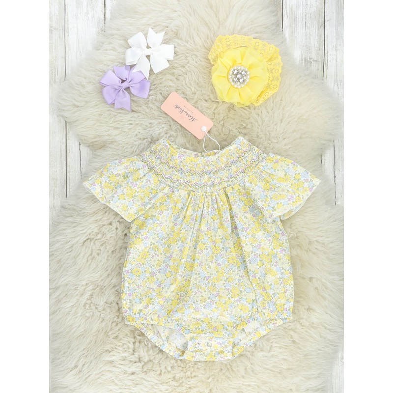 Thisgorgeous sister setis perfect for your dainty girls! Thisbubble features smocking, gorgeous yellow florals, & buttons at the nape of the neck.