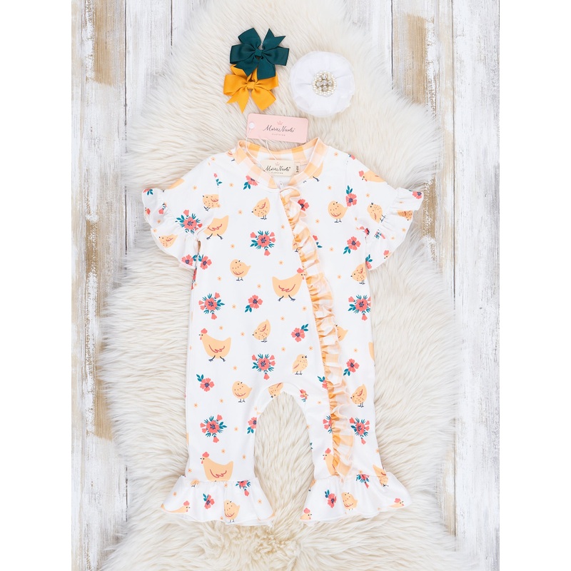 Cluck intospring withthis sister set. Featuring chickens & florals and a bright canary yellow, the Gingham ruffle hem adds a playful touch to this must-have romper. Perfect for your little one's outdoor adventures and cute seasonal photos!Snap buttons.Fits