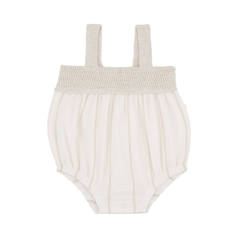Striped lurex poplin sleeveless romperStraps trimmed in soft knitSoft elastic around the legsButtons at the back99% cotton, 1% lurex