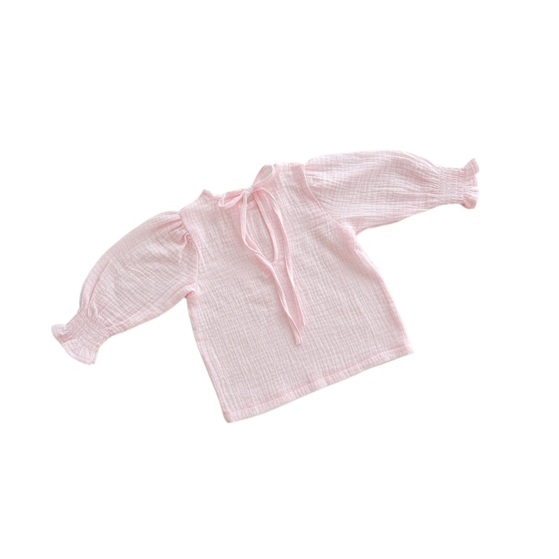 Cotton blouse featuring functional tie on the back of the neck and shirred cuffs. Mix and match with items from our Grace + Cora Collections.