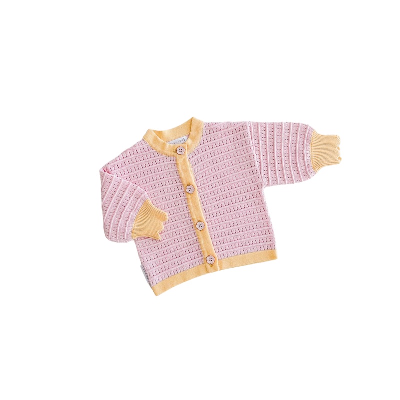 Eyelet knit cardigan featuring scalloped cuffed sleeves and functional flower buttons. Mix and match with items from our August, Butter, Freya + Clementine Summer Collections.