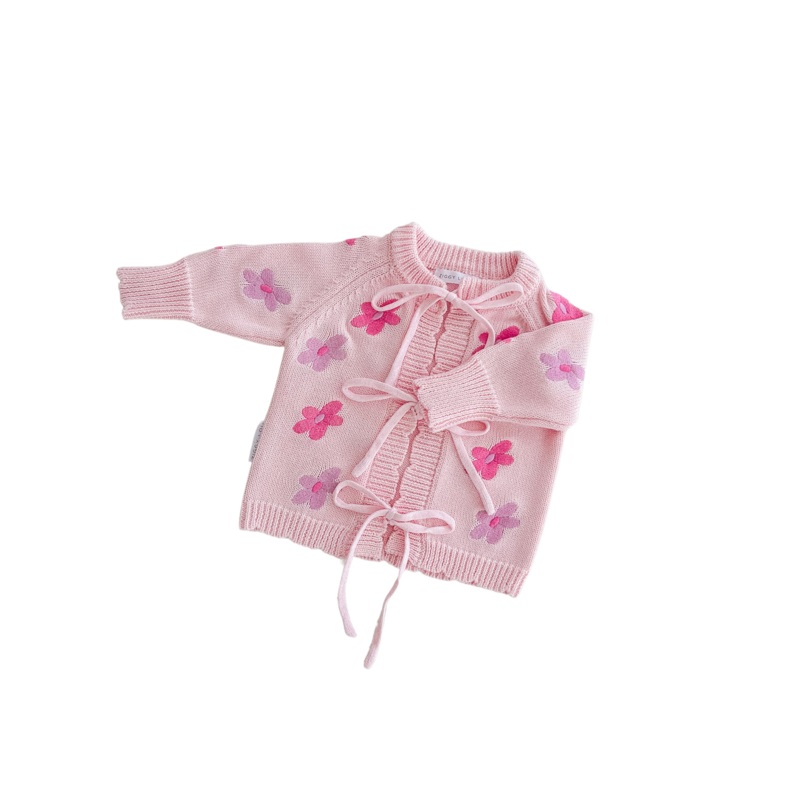 Knitted tie up cardigan featuring our embroidered Cora design, scalloped cuffed sleeves and functional ties down the front. Mix and match with items from our Cora Collection.