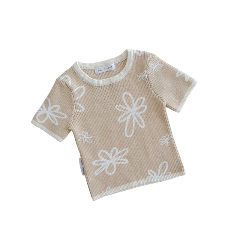 By Ziggy LouLatte ribbed short sleeve tee with frill hem + sleeve detail, featuring our printed Gia design in milk. Mix and match with our Gia, Cappuccino + Sorrento Summer Collections.Please Note||| This is a screen printed design. Each individual garment