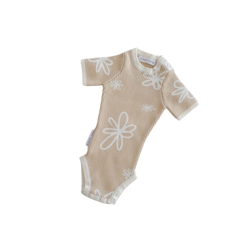 By Ziggy LouRibbed short sleeve bodysuit in our Latte + Milk colours featuring our Gia printed design and scalloped edge detail. Functional press snaps at crotch for easy nappy changes and press snaps on shoulder for easy on/off. Mix and Match with items f